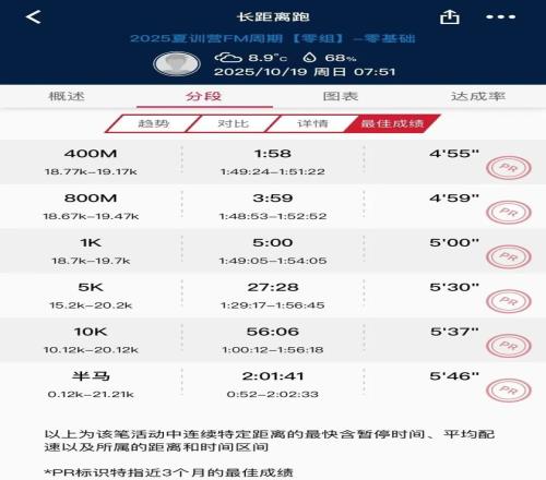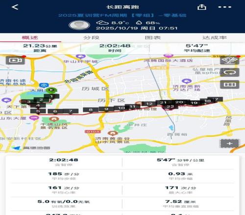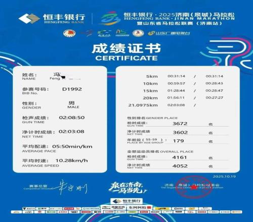 | 10月19日我完成了济南半程马拉松,这场赛事对我来说有着特殊的意义:我从出生、小学、初高中都是在这个城市度过的;1985年高中毕业后到外地读书,大学毕业后工作最初的几年也在这个城市,我可以说是个“老济南“。今年还是我高中毕业的第40年,且9月份还刚刚参加了一个毕业40年的高中同学会。聚会时我也提起要回老家参加10月份的济南半程马拉松,同学们表示出了佩服又怀疑的态度。可能之前连我自己也没有想到能在40年后回到家乡完成一场半程马拉松,以这样一种形式纪念我早已逝去的青葱岁月。 早上六点四十五分我到达起点处,感觉济南马拉松进场有点拥挤、通行效率不高,安检、进场、存包等环节都有点拥堵,约半个多小时才完成进场流程进入起跑等候区。虽然起点区域人多有点拥挤,我仍努力完成训练营学到的那一整套热身动作。我独自一人默默地、严肃地热身,再加上我这一身还貌似比较专业的服饰,想必周围人没准儿误以为我是一个“老手“,其实我仅仅是刚参加了第二场半马的”老菜鸟“而已。7点45分枪响后,我大概用了四五分钟才通过计时起点,通过起点后我开表计时,并打开事先设好的节拍器(186步频)帮助自己维持步频。 前2公里我本想按照教练指导的比赛策略有意识地压一下配速逐渐找找状态,但不知道是回到家乡兴奋还是起跑前喝了赛速饮的原因,起跑后我感觉状态很好(赛后分析是兴奋导致的),第1公里后我的心率就升到2区,配速第一公里6:47,还在计划中;第二公里就到6:18,体感和状态都感觉良好;2公里后我逐渐提速,也许受到赛场气氛的感染和裹挟,我的配速从4公里后达到5:52左右,7公里后5:45左右,9公里后5:35左右。 六七公里后我碰到了一个之前没有预判的难题——济南赛道比较特殊,就是终点的海拔要高于起点100多米。虽然我对这个地形地貌导致的赛道爬坡困难有思想准备,但没有预判到中途赛道中的多次起伏、出现很多长缓坡的上下赛段。七八公里处第一个上下坡跑完后,我感觉匀速巡航跑的策略恐怕自己控制不了,跑下坡对我这种膝盖有慢性伤病的人很不友好,加上今天的配速已经超出了训练时的最高配速,决定马上调整一下跑步策略——即重点关注体感和心率,忘记配速,上坡时心率适当可以提高,超出2区达到3区也可以容忍(甚至在临近爬坡的最高点时心率达到了4区),争取上坡时不掉速很多;下坡时缩小步幅有意识压一下配速,缓解一下急促的呼吸并调整一下心率;上坡时有意识提高配速、下坡时有意识降低配速,使得配速起伏不要过大。最重要跑步过程中无论上下坡还是平缓路面都时刻牢记关键跑姿、维持核心稳定保持框架不散掉,上下坡都不要跨步和后腿推蹬发力,体会大腿提拉和身体前倾、重力产生的前腿自然落下,时刻保持步频踏准步频器节奏(维持步频在186以上)。 跑的过程中,我全身心关注在跑姿、步频、心率和体感,不再关注配速和距离、也不再欣赏沿途的风光,顶着心率完成一个上坡,接下来的下坡压一下步幅适当缓解一下心率和呼吸,就当给自己疲劳的心肺小小奖励一下。我猜想,可能是因为我一直注意维持在关键跑姿,上坡时除了心率升高导致有点呼吸急促外,腿部肌肉并没有感到额外的疲劳。 不知道是跑姿吸引,还是步频器的吸引?更或许是一头白发引人关注,七八公里后有个年轻小伙一直跟着我并排跑。他年龄还不到40岁,我鼓励了他几句,并叮嘱他“保持节奏“。10公里后我感觉我一直在超越别人,很少有人从后面超过我,只有在18公里后才觉得开始被人超过。济南赛道难度最大的是17、18公里是接近2公里的大长上坡,很考验体能和意志力,之后折返原路返回、接下来是接近2公里的长下坡。对于膝盖有旧伤的我来说,这段下坡只能收着点跑(感觉就是在这段时间才有不少人超过我)。20公里后又是一个接近1公里的上坡,临近终点才有2百米左右的平缓路面。最后一公里赛道是个上坡,不知道是体能剩余不足,还是感觉今天配速超预期太多,这一公里我没敢全力冲刺,最后一两百米平缓赛道我提前查看手表估算肯定能跑进2:03之内(实际我开表时间是过了起点计时带、稍微滞后10来秒,导致我手表成绩快于实际计时成绩),为了享受最后100米赛道、也为了冲线有个轻松愉悦的表情避免龇牙咧嘴,我留给终点一个美好pose,匀速跑过终点。 跑过终点的那一刻,我脑海中冒出了一句很俗的Slogan:出走40年,归来依旧是少年。 回顾我的跑步历程—— 我在今年7月下旬开始参加跑步学院的夏季线下训练营,龙井教练根据我的实际体能情况将我安排在零基础组,因为已经开营差不多一个月了,加上我初期体能状态不好,教练开始给我制定了一个起点相对较低、循序渐进的训练方案,现在看还是很科学和负责任的。这期间我曾因为自我感觉良好就自作主张加大训练强度,从而导致膝盖伤病复发停训了三周。现在看来一切还是应该按照教练的指导和计划科学训练,欲速不达反而影响训练效果,还有引发伤病的风险。 因为我年龄大、体能较差,之前的跑步基础弱(2025年初才首次参加训练营,之前没有任何跑步基础)。跑姿方面:轻微跨步、后腿推蹬、轻微膝内扣,从手表上主要体现在垂直振幅偏高、步频偏低;体能方面:全方位力量弱,很多训练动作完成不了或者做不到位,臀腿力量不足很多动作想做也做不到位,力量不足、本能的身体代偿机制