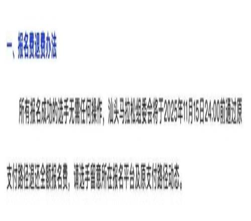 公告显示,因赛事取消,2025汕头马拉松组委会将全面启动报名费退还及交通、住宿退订手续费补偿工作,全力保障已报名选手的权益。 根据组委会安排,所有报名成功的选手无需进行任何操作,组委会将于2025年11月15日24:00前通过原支付路径退还全额报名费,请选手留意所在报名平台及原支付路径动态。