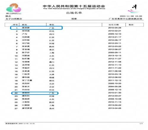 北京时间11月1日,全运会官网发布了11月8日女子10米台预赛的27人参赛名单,全红婵并不在列,广东队派出两位出生于2010年的小将蒋林静、谢佩铃。这意味着,全红婵不会参加2025全运会女子10米台单人项目的比赛,也就无缘实现全运会女子10米台两连冠。