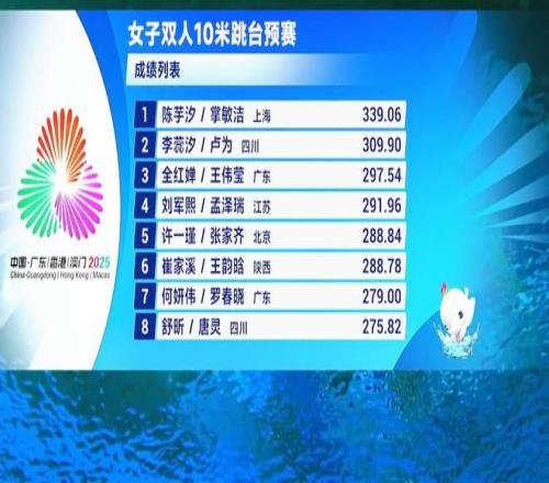 陈芋汐双人预赛339.06分夺第1!全红婵组合失误排第3,张家齐第5