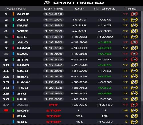 | 2025赛季F1大奖赛本周末来到英特拉格斯赛道,在刚刚结束的冲刺赛上,皮亚斯特里遭遇事故退赛,诺里斯领跑获得冠军!安东内利获得第二,拉塞尔紧随其后,维斯塔潘拿到第四! 在今天凌晨结束的冲刺排位赛上,诺里斯以1:09.627拿到杆位,安东内利第二,皮亚斯特里第三,维斯塔潘仅仅位列第6的位置。 冲刺赛五盏红灯熄灭,大家起步都没有问题,维斯塔潘超越阿隆索上到第五位。比赛进行到第6圈,皮亚斯特里上墙!克拉平托与霍肯伯格也卷入事故,赛会干事先是启动安全车,随后还是出示红旗!小皮和克拉平托退赛,回放显示皮亚斯特里、霍肯伯格和克拉平托都是在压到3号弯的潮湿路肩后失控撞墙。 比赛随着滚动发车重新开始,前方车阵虽然靠的挺近,但是始终没有能够到DRS区,使用红胎的诺里斯逐渐被安东内利追近,第20圈时,安东内利进入诺里斯的DRS区,但是很难完成超越,勒克莱尔则是超越阿隆索来到第五的位置。博托莱托则是在最后一圈打滑上墙退赛。这车估计一时半会也修不好了…… 最终,诺里斯PTW,安东内利和拉塞尔分列二、三名,维斯塔潘第四。 |