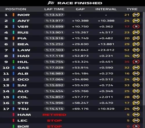 | 2025赛季F1巴西站落下帷幕,诺里斯杆位起步夺冠!安东内利同样守住位置获得第二,维斯塔潘维修区起步最终争到第三!他也高票当选本场比赛最佳车手!拉塞尔第四,皮亚斯特里因为罚时以第五完赛,而两台法拉利则先后遭遇撞车退赛…… 由于排位赛在Q1被淘汰,维斯塔潘在本场比赛前开启一套新的动力单元,因此从维修区起步,同样从维修区起步的还有奥康。 英特拉格斯赛道在赛前受到一点雨水影响,不过好在比赛开始前大家都能用干胎起步,前十发车的车手中有六人使用红胎,诺里斯、勒克莱尔、皮亚斯特里以及拉塞尔则选择了黄胎,维修区起步的维斯塔潘和奥康都选择了白胎。 五盏红灯熄灭,起步相安无事,诺里斯守住位置,皮亚斯特里也顶住了哈贾尔的进攻,不过在10号弯附近,主场作战的博托莱托和斯特罗尔发生碰撞,博托莱托上墙退赛并且引发安全车。 汉密尔顿和克拉平托同样发生碰撞,前者的前翼被毁,底板也受到了影响。 第6圈比赛重新开始!皮亚斯特里和勒克莱尔同时对安东内利发起进攻!然而一号弯又发生事故!皮亚斯特里和安东内利发生碰撞,安东内利挂到勒克莱尔,后者左前胎报废退赛……虚拟安全车又来了。与此同时,皮亚斯特里已经来到诺里斯身后。 车队提醒维斯塔潘左前胎有可能爆胎,因此虚拟安全车期间他进站换上黄胎。第9圈比赛再度重启,换上新黄胎的维斯塔潘开始不断刷紫。第13圈,面对底板受损的汉密尔顿,维斯塔潘轻松将其超越。赛事干事同时对角田进行了10秒罚时。 第16圈,皮亚斯特里的处罚报告出炉,罚时10秒。第18圈维斯塔潘已经来到第9的位置!随后一圈,选择红胎起步的车手纷纷进站,维斯塔潘已经来到第6的位置。第21圈,维斯塔潘超过阿尔本来到第5,安东内利进站后,他来到第4,不过对于维斯塔潘来说,应该还需要一次进站才能完成比赛。 安东内利换上新黄胎后一路猛追到第7,而诺里斯在第31圈选择进站换上一套旧红胎,这意味着诺里斯也准备两停,红胎带来的圈速提升让诺里斯很快就在第33圈超过维斯塔潘来到第三的位置。 第35圈,维斯塔潘黄换黄落到第12位,不过他已经提前完成了两停,第38圈时,他已经来到第6位,诺里斯则已经追到了没进站的皮亚斯特里身后8秒左右。同圈,汉密尔顿被车队召回P房退赛,皮亚斯特里在这一圈进站接受10秒罚时,同时换上红胎,出站时他排在第8的位置,接下来要开启追击模式了。 第48圈,安东内利第二次进站换上一套旧黄胎,拉塞尔随后也进站,同样是一套旧黄胎。前三现在变成了诺里斯、维斯塔潘以及皮亚斯特里,然而现在看起来诺里斯和皮亚斯特里还得进一次。 果然在第51圈诺里斯进站落到皮亚斯特里身后,不过随后皮亚斯特里也进站落到第7,维斯塔潘就这样来到了领先位置,不过他的黄胎已经跑了17圈,也很难挡住身后的诺里斯。 第55圈,维斯塔潘第三次进站换上全新红胎!出站时他排在第4!接下来就是场上决胜负了!第60圈车队告诉维斯塔潘,如果顺利的话他至少可以登上领奖台。比赛还剩10圈时,维斯塔潘已经追到拉塞尔的DRS区,随后在第63圈一号弯就完成超越升到第3。 最后4圈,维斯塔潘进入安东内利的DRS区,不过红胎也到达极限,最终诺里斯第一完赛!安东内利守住位置第二完赛,维斯塔潘尽管只拿到第三,但要知道他是从维修区起步,实属不易,拉塞尔第四,皮亚斯特里第五。 |