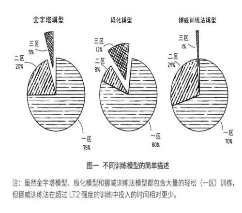 与世界上大多数耐力训练采用的五区划分方式不同,挪威训练法是简单的三区划分,即有氧阈值之下的轻松区、无氧阈值之上的强度区,以及两个阈值之间的混合区(图一)。
