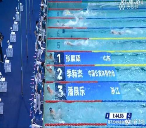 11月12日,赢得全运会男子200米自由泳冠军,成绩为1分44秒86。 这个项目的亚洲纪录由孙杨保持的1分44秒39,半决赛中张展硕延续优异表现,游出1分46秒89,位列所有选手的第一位。