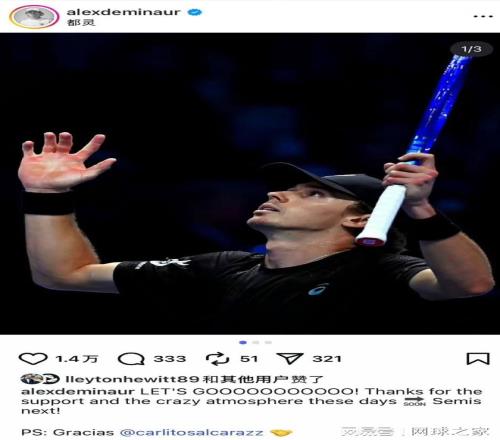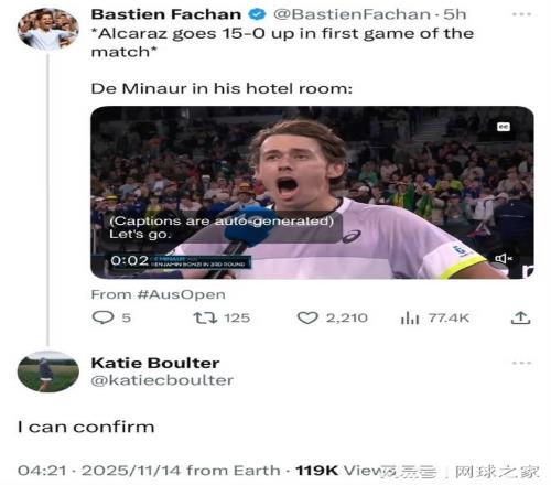 最终,没有意外!阿尔卡拉斯轻松击败穆塞蒂为自己锁定了出线名额,同时也助力德米纳尔晋级年终总决赛四强。赛后,社交媒体上传出了一段趣事,一位网球博主调侃道:“比赛才进行到第一局,阿尔卡拉斯15-0领先穆塞蒂,而德米纳尔已经在酒店房间里激动地为阿尔卡拉斯加油了。” 更令人惊喜的是,德米纳尔的女友博尔特随后亲自回复证实:“我可以确认是这样。”这段互动瞬间在社交媒体上引发热议。