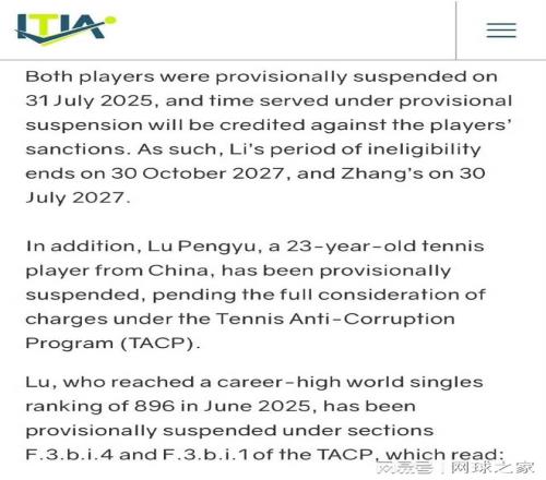情况如下:国际网球诚信机构(ITIA)近日公布对中国网球选手李文夫、张瑾和陆鹏宇的处罚决定,两位“00后”小将因操纵比赛牟利遭禁赛,另一人因违反反腐败规定被临时停赛且上诉被驳回,具体禁赛时间还需要国际反腐败机构的进一步考虑和裁定。 这一发生在中国网球运动蓬勃发展时期的年轻选手集体违规事件,为整个行业敲响了警钟。 ITIA的处罚公告显示,21岁的李文夫与张瑾在2024年的调查中坦言,为获取报酬参与了比赛操纵。由于二人未对ITIA的指控作出回应,也未行使上诉权利,相关制裁已正式生效。