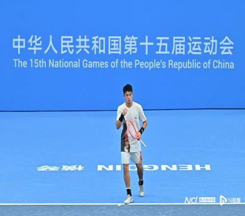 吴易昺在比赛中。 男单比赛期间,3号种子、浙江选手吴易昺首度亮相中心场,最终以6:0、6:1击败了天津选手刘少云,成功闯入男单16强。作为中国网协首位在大满贯单打正赛获胜的男选手、首位ATP巡回赛单打冠军获得者,吴易昺也期待能在十五运会的舞台上取得好成绩。 赛后吴易昺表示,从排名上看,本次男单比赛确实是历届全运会里竞争最激烈的,“每个人都有自己的优势,每个人也都会有自己的一些压力,今年可能会产生一位新的男单冠军,球迷朋友们也可以期待一下。” 其他男单比赛中,1号种子布云朝克特、6号种子孙发京、7号种子崔杰、8号种子张之臻等纷纷晋级16强。东道主广东选手、11号种子莫业聪则以盘分1:2输给了河北选手尼敦坚赞,无缘男单16强。