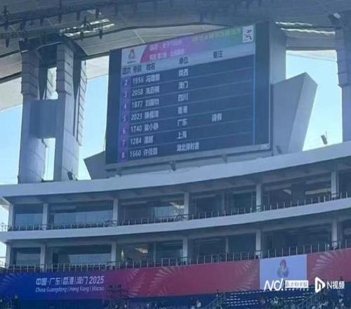 现场大屏幕显示梁小静“请假”。梁小静在前一晚男女混合4x100米接力比赛中不慎摔倒受伤。