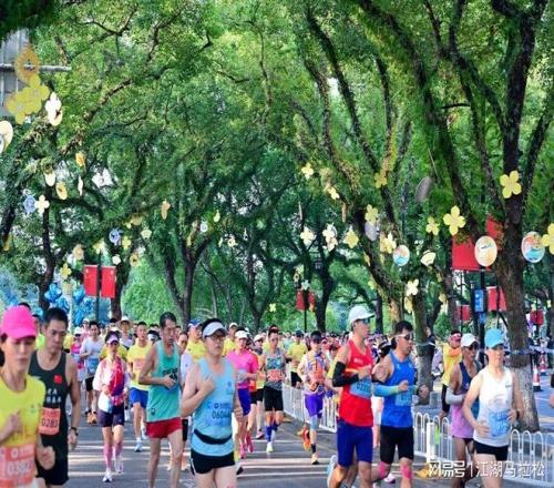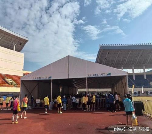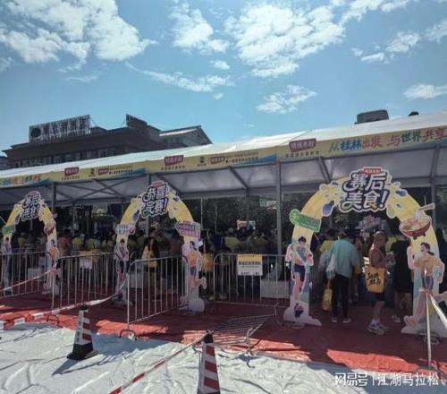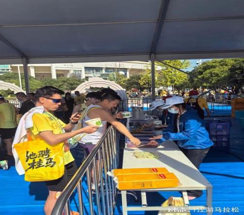 给我感觉,整个赛事在气氛上是下了功夫的,不管是赛前领物入场时的欢迎,还是领参赛包时小姑娘挥舞着手喊你过去;亦或是发放完赛包时一声声问候和祝福,让你时时沉浸在桂马的热情中。 我记得以前起点区域一小部分选手在直道上,后面的要拐过来,今年所有选手全在中山北路上,23000人,浩浩荡荡。集结区两侧的移动卫生间挺多,也有不少的小便池,反正我是没看到有人排队。 终点最大的变化,是体育中心拿出来用了,将拉伸、冰敷以及发奖仪式放在场内,且有多个适合拍照打卡的背景板,仪式感甚强。 美食区也有点“鸟枪换炮”的味道,通道很多,想吃碗米粉,也不用排太长的队了。其实完赛后服务挺多的,不过我印象中有点点散乱,应有较大的优化空间。