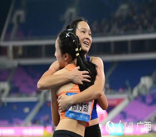 十五运会田径比赛女子100米决赛现场。人民网 雷琦竣摄 发令枪响,七道身影如箭离弦,在百米红色跑道上划出凌厉轨迹。仅十余秒,扎着利落双马尾的16岁小将陈妤颉率先撞线,而征战该赛道接近二十载的34岁老将韦永丽紧随其后。 “11秒10!破亚洲青年纪录!”计时牌定格的瞬间,全场沸腾。 11月17日晚,这场备受瞩目的十五运会女子百米飞人大战中,浙江选手陈妤颉以这一惊人成绩夺冠,并成为全运会史上最年轻的百米女飞人。 终点线外,全场目光聚焦之处,韦永丽笑着张开双臂,与年轻冠军陈妤颉紧紧相拥,她用手轻拍女孩的后背,眼中情绪翻涌,短短几秒,便仿佛完成了一场庄严的新老交接,“传承”在此刻具象化。