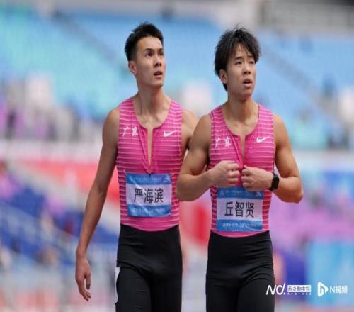 严海滨与队友丘智贤。 早在十五运会开始前,苏炳添就多次提及自己只会参加接力项目,且全运会将是其职业生涯的最后一次参赛。今日预赛,苏炳添会不会上场也是舆论极为关注的话题,不过临赛前公布的预赛名单里没有出现他的名字,广东队派出了中生代选手严海滨以及另外三名年轻队员出战,最终有惊无险晋级决赛。