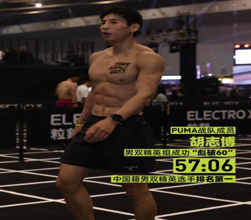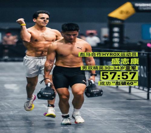 作为彪马合作 HYROX运动员,「爆师傅」苏琰就获得了和洪范锡客串搭档的机会,并近距离和顶尖高手讨论备赛。此次,他在上海站斩获了1小时47秒的成绩,不仅刷新了他的PB,也让他离「60分钟」的目标又近了一步。 HYROX风潮席卷国内,推动赛事水准持续跃升,中国选手的表现也因此不断突破。本站比赛中,彪马中国合作的HYROX运动员盛志康、陆鹏,以及彪马战队成员马东昊、胡志博,在男双精英组别中均于60分钟内完赛,成功「彪破60」。