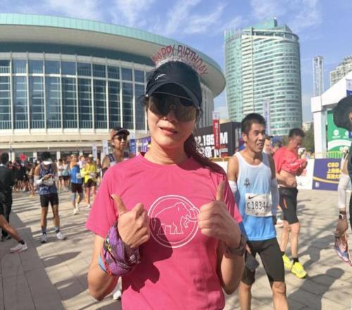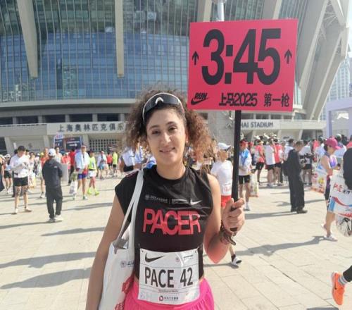 作为去年就参与过上马的“老熟人”,阿塞拜疆跑者吕菲今年成为了官方配速员。 当新突破遇上旧情怀 来自哈萨克斯坦的亚历山大(Semenov Alexandr)有着六年跑龄,首次来到上海,城市的美丽与赛事的专业程度超出他的预期,“每个人都会期待在这里有新的PB(个人最好成绩),因为这是一场非常棒的比赛,还有绝佳的天气加持。” 而作为去年就参与过上马的“老熟人”,阿塞拜疆跑者吕菲(Eynullayeva Nilufar)今年有了新身份,那就是配速员“兔子”。 “这次是带着大家跑,3小时45分钟的标准不是为自己而跑,而是帮助更多人达成目标,这种体验完全不同。”沿途遇到不同国家、不同背景、不同经历的跑者,让她感受到了奔跑连接人心的力量,“这就是上马的魅力,让你能够感觉到不是一个人奔跑,而是在一个多元的地球村。” 如果说,外籍跑者的身影是上马国际化的注脚;那么,本土跑者的坚守与热爱,则是赛道最深层的情感底色。 53岁的上海人黄佳已经连续十年征战上马,见证着赛事的每一步成长。“现在全民健身的氛围越来越浓,跑者的水平越来越高,中签也就越来越难。”今年他用AI制定训练计划,尽管没能PB,但3小时30分的完赛成绩让他满意,“三次发枪的安排很合理,喷雾和补给都很充足,沪语的加油声一直陪着我,很亲切。”