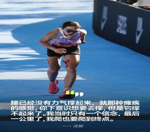 上马起跑前 沈妮在脖颈系上了防热的吸汗巾 这是姚妙传授给她的经验 前半程我跑得挺顺的,体感和状态都不错。甚至过了35公里,我能远远看见姚妙的身影,大概落后她一二百米。我心里只有一个目标:突破231。 最后几公里,腰伤隐隐发作。我每跑几步就得用手撑一下腰。到最后一公里,腰疼彻底爆发了——腰根本直不起来,整个人佝偻着往前挪,感觉随时会摔倒。但我告诉自己不能倒,一摔可能伤得更重,影响后面的训练。我硬顶着,实在顶不住,只好尝试降速。但前面冲得太快,身体有惯性,想慢下来也不容易,还怕失去平衡摔倒。整个人像在和自己身体打架,意志拼命拖着身体往前。