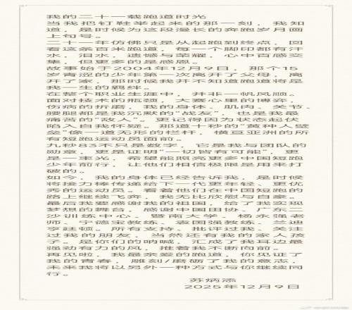 | 12月9日,男子100米亚洲纪录保持者、中国短跑名将苏炳添宣布退役。 12月9日,苏炳添在个人账号上发布长文《我的二十一载跑道时光》: