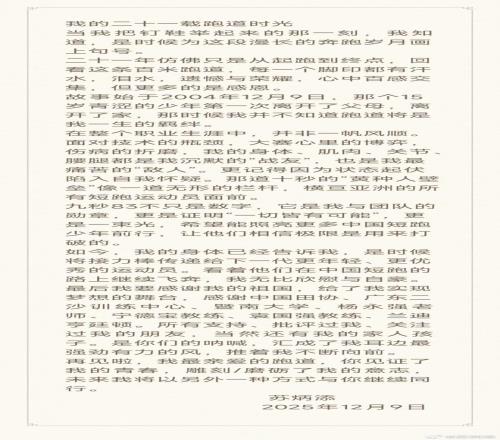 | 镜头内 镜头一:2025年12月9日,田径男子100米亚洲纪录保持者、中国短跑名将苏炳添宣布退役。他在自己的社交媒体上发文,回顾了自己21年田径生涯的心路历程。