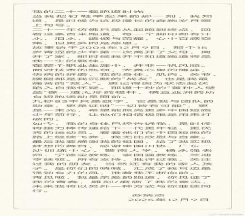 | 今天上午,被誉为“亚洲飞人”的男子100米亚洲纪录保持者、短跑名将苏炳添,通过社交媒体发表长文《我的二十一载跑道时光》,正式宣布退役。