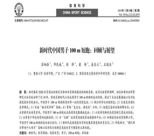 苏炳添以第一作者身份发表的论文丨参考文献[1] 自己分析自己 几年来的变化 在上图这篇论文中,苏炳添先回顾了中国男子100米短跑的发展,描记出9年间最好成绩的上升趋势,文中标注“全国纪录是笔者2018年创造的9.91s”。