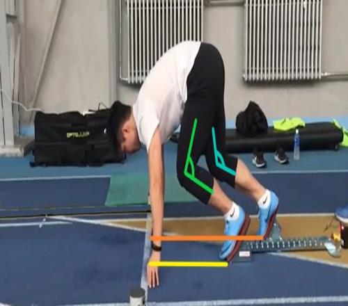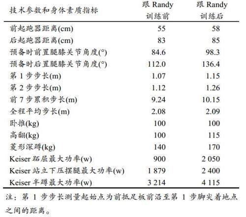 跟随兰迪训练前、后苏炳添部分技术参数和身体素质对比丨参考文献[1] 这些变化 如何将苏炳添送入决赛 对比上面表格后两列的数值,可以看出苏炳添在体能训练和专项技术上都做了调整,这些变化与百米成绩之间有着怎样的联系,接着看苏炳添自己的分析。 起跑姿势更加舒展 表格前四行是对起跑姿势的描述,适当的预备状态是发令枪响后有力蹬离起跑器的前提。苏炳添近年调整了起跑姿态,把起跑器前、后抵足板距离起跑线的距离分别向后移动了3厘米和2厘米,并且明显增加了双腿的髋、膝关节角度。 苏炳添分析,这样的姿势使自己的躯干与下肢相对位置更加舒展,减小了臀肌和腘绳肌等后群肌的拉伸幅度,减缓了股直肌和髂腰肌等前群屈髋肌群的紧张度,可以更好地利用肌肉牵张反射和肌肉适宜收缩初长度,使下肢关节处于最佳用力角度,加快起跑蹬离速度。