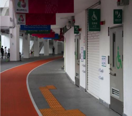 天河体育中心的无障碍设施 而在广州市残疾人体育运动中心,这里的细节也体现出人性化的温度:场馆内的低位脚踢按钮、盲文标识、语音提示让充分考虑到不同类型残疾人的需求。此外,这里的更衣室与卫生间充分预留轮椅空间,无障碍通道消除的高差精准到厘米级别,还有集成语音盲文服务桩、蓝牙播报、3D手语翻译等功能的智慧无障碍服务系统。 在“零障赛区”理念的指导下,和场馆衔接的城市街区也同步进行了无障碍改造,广州场馆周边17个精致街区全部增设了全宽式缘石坡道与平缓转弯半径,让无障碍出行的便利融入市民日常生活。 在实地感受了广州“零障赛区”的建设效果后,残特奥会旱地冰壶赛事香港代表队领队卢俊贤表示,从交通接驳到赛场设施,广州都提供了国际化水准的无障碍保障和人性化的细致关怀,为运动员提供了极大的便利。 作为全国无障碍建设示范城市,深圳在首次承办残特奥会这种全国性残疾人赛事的过程中也全力以赴,将无障碍建设的细节体现在每个环节中,全力打造一套覆盖“竞技-服务-生活”的立体化无障碍网络。 在深圳市体育中心,这里的台阶全部改造成平缓坡道,新增设的无障碍卫生间、淋浴间、轮椅坐席、盲文指引与语音导览地图无缝衔接。龙岗国际自行车赛场的改造更具针对性,新增防滑坡道、荧光盲道与智能升降平台,搭配高对比度标识与触觉导航设计,彻底避开了所有台阶障碍,为所有参赛运动员提供了贴心保护。 在深圳的赛事接待酒店,所有运动员客房均加装墙角防撞条与声光报警器,浴室专门铺设防滑地砖并配备吸盘式淋浴座椅;大堂设置轮椅存放区与残障用品仓储柜,24小时响应设施使用需求。酒店还为轮椅使用者优先分配低楼层近电梯客房,为视障运动员规划相邻 “互助单元”,“在这里能自主完成洗漱、休息,就像在自己家一样安心。”参加残特奥会射箭比赛的四川队射箭运动员赵静表示。 保障机制确保每个改造细节落地 在珠三角九市高标准完成场馆侧和城市侧无障碍建设的背后,残特奥会赛事组委会一整套保障机制功不可没。 在各地筹备赛事期间,广东赛区就编制印发《广东省大型体育运动会赛区无障碍建设技术指南》和《广东省大型体育运动会赛区无障碍建设技术图集》,为各地制定场馆无障碍体检方案,指导场馆的无障碍改造,它们也是全国第一个大型赛会无障碍建设指南图集。