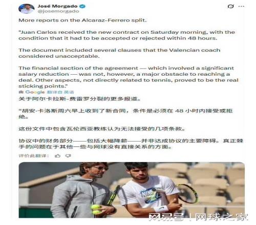 费雷罗自2018年起开始指导阿尔卡拉斯,当时这位西班牙小将年仅15岁。在他的指导下,阿尔卡拉斯于2022年在美网夺冠,成为史上最年轻的男子世界第一。尽管如此,在师徒间冲突不断激化的情况下,两个人最终分手也不足为奇。而这也恰恰印证了此前诸多报道中所说的那样,费雷罗与阿尔卡拉斯真正结束合作的根本原因并非是因为网球因素。 在社交媒体上,阿尔卡拉斯与费雷罗分手的消息引发了广泛讨论。 一位名为“TennisForever”的网友写道:“家庭和商业已经介入太多。阿尔卡拉斯需要的是专注于网球的人,而不是利用他名声的人。也许分手对双方都好。”