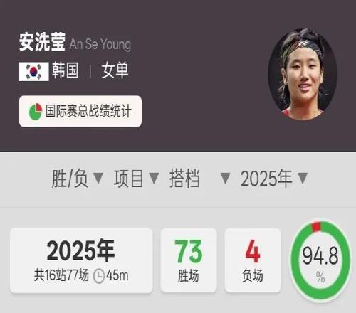 这是安洗莹今年的战绩。而纵观她的职业生涯,她一路都在改写韩国羽毛球的历史。 2017年,还在光州中学读三年级的安洗莹,以七战全胜通过国家队选拔,是历史上首位入选韩国国家队的中学生。次年,安洗莹便在爱尔兰公开赛中一举夺冠,获得个人首个成年组冠军。 2019年,安洗莹接连拿下新西兰公开赛、加拿大公开赛、秋田大师赛、法国公开赛和韩国光州大师赛五个冠军,当选世界羽联年度最佳新人。尤其是法国公开赛决赛,安洗莹逆转里约奥运会冠军、西班牙名将马林,成为首位在世界羽联高级别赛事中夺冠的青少年选手,震惊羽坛。 拿下杭州亚运会的女单、女团金牌后,安洗莹又在巴黎奥运会女单决赛中以2比0击败中国选手何冰娇,为韩国赢得28年来该项目的首枚奥运金牌。 如今,这位23岁少女,已经手握奥运会、世锦赛、亚运会女单金牌,并且在大赛上屡屡带韩国队站上最高领奖台。可以说,世界羽坛已经进入“安洗莹时代”。