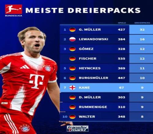 | 在上周拜仁客场4-1击败霍芬海姆的比赛中,凯恩完成了帽子戏法,北京时间9月23日,德国转会市场列举了德甲球员在联赛中完成帽子戏法次数的排行榜,其中盖德-穆勒居首,凯恩位列第七名。