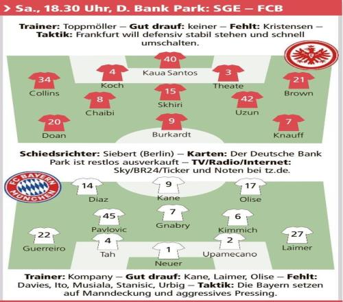 雷速体育10月4日讯 北京时间10月5日00:30,德甲第6轮,法兰克福坐镇主场迎战德甲领头羊拜仁慕尼黑,本场比赛开始之前,德国媒体《慕尼黑日报》预测了双方的首发阵容,拜仁慕尼黑由目前脚感火热的凯恩领衔,法兰克福方面会继续首发连场进球的土耳其小将詹·乌尊。 拜仁慕尼黑方面首发 守门员:1-诺伊尔 后防线:27-莱默尔、2-于帕梅卡诺、4-若纳唐·塔、22-格雷罗 中场:6-基米希、7-格纳布里、45-帕夫洛维奇 攻击线:17-奥利塞、9-凯恩、14-路易斯·迪亚斯 法兰克福方面首发 守门员:40-考阿·桑托斯 后防线:34-科林斯、4-科赫、3-泰特、21-纳撒尼尔·布朗 中场:8-查比、15-斯希里 攻击线:20-堂安律、9-伯克特、42-詹·乌尊、7-克瑙夫 |