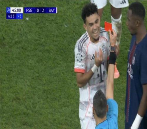 第32分,大巴黎再遭打击,马尔基尼奥斯后场控球犹豫,被路易斯-迪亚斯上前断球,然后一路杀入禁区,右脚劲射破门,拜仁将比分扩大到了2-0,迪亚斯上演梅开二度好戏,但是在上半场补时阶段,阿什拉夫带球突破时被路易斯-迪亚斯从身后铲翻,动作幅度巨大,主裁第一时间只给了黄牌。VAR提醒后,慢动作显示迪亚斯存在危险动作,直接改判红牌。刚刚上演梅开二度的英雄,瞬间从英雄变成罪人。