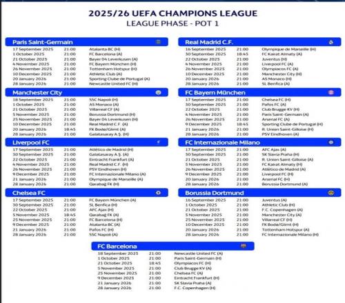 直播吧08月30日讯 欧足联官方公布欧冠联赛阶段赛程,欧冠正赛联赛阶段共36队,每支球队进行4主4客8场比赛。联赛阶段结束后,前8名直接晋级淘汰赛,第9名-第24名将参加淘汰赛附加赛,具体对阵由抽签决定。 以下是欧冠主要球队的赛程(以下均为北京时间): 皇马赛程: 第1轮:9月17日03:00 皇马vs马赛 第2轮:10月1日00:45(哈萨克时间9月30日21:45)阿拉木图凯拉特vs皇马 第3轮:10月23日03:00 皇马vs尤文 第4轮:11月5日04:00 利物浦vs皇马 第5轮:11月27日04:00 奥林匹亚科斯vs皇马 第6轮:12月11日04:00 皇马vs曼城 第7轮:2026年1月21日04:00 皇马vs摩纳哥 第8轮:2026年1月29日04:00 本菲卡vs皇马 巴萨赛程 第1轮:9月19日03:00 纽卡斯尔vs巴萨 第2轮:10月2日03:00 巴萨vs巴黎圣日耳曼 第3轮:10月22日00:45 巴萨vs奥林匹亚科斯 第4轮:11月6日04:00 布鲁日vs巴萨 第5轮:11月26日04:00 切尔西vs巴萨 第6轮:12月10日04:00 巴萨vs法兰克福 第7轮:2026年1月22日04:00 布拉格斯拉维亚vs巴萨 第8轮:2026年1月29日04:00 巴萨vs哥本哈根 利物浦赛程 第1轮:9月18日03:00 利物浦vs马竞 第2轮:10月1日03:00 加拉塔萨雷vs利物浦 第3轮:10月23日03:00 法兰克福vs利物浦 第4轮:11月5日03:00 利物浦vs皇马 第5轮:11月27日03:00 利物浦vs埃因霍温 第6轮:12月10日03:00国际米兰vs利物浦 第7轮:2026年1月22日04:00 马赛vs利物浦 第8轮:2026年1月29日04:00 利物浦vs卡拉巴赫 巴黎赛程 第1轮:9月18日03:00 巴黎vs亚特兰大 第2轮:10月2日03:00 巴萨vs巴黎 第3轮:10月22日03:00 勒沃库森vs巴黎 第4轮:11月5日03:00 巴黎vs拜仁 第5轮:11月27日04:00 巴黎vs热刺 第6轮:12月11日04:00 毕尔巴鄂竞技vs巴黎 第7轮:2026年1月21日04:00 葡萄牙体育vs巴黎 第8轮:2026年1月29日04:00 巴黎vs纽卡斯尔 曼城赛程 第1轮:9月19日03:00 曼城vs那不勒斯 第2轮:10月2日03:00 摩纳哥vs曼城 第3轮:10月22日03:00 比利亚雷亚尔vs曼城 第4轮:11月6日04:00 曼城vs多特蒙德 第5轮:11月25日04:00 曼城vs勒沃库森 第6轮:12月11日04:00 皇马vs曼城 第7轮:2026年1月21日04:00 博德闪耀vs曼城 第8轮:2026年1月28日04:00 曼城vs加拉塔萨雷 切尔西赛程 第1轮:9月18日03:00 拜仁vs切尔西 第2轮:10月1日03:00 切尔西vs本菲卡 第3轮:10月23日03:00 切尔西vs阿贾克斯 第4轮:11月6日01:45 卡拉巴赫vs切尔西 第5轮:11月26日04:00 切尔西vs巴萨 第6轮:12月10日04:00 亚特兰大vs切尔西 第7轮:2026年1月22日04:00 切尔西vsAEP帕福斯 第8轮:2026年1月29日04:00 那不勒斯vs切尔西 国米赛程 第1轮:9月18日03:00 阿贾克斯vs国米 第2轮:10月1日03:00 国米vs布拉格斯拉维亚 第3轮:10月22日03:00 圣吉罗斯vs国米 第4轮:11月6日04:00 国米vs阿拉木图凯拉特 第5轮:11月27日04:00 马竞vs国米 第6轮:12月10日04:00 国米vs利物浦 第7轮:2026年1月21日04:00 国米vs阿森纳 第8轮:2026年1月29日04:00 多特蒙德vs国米 拜仁赛程 第1轮:9月18日03:00 拜仁vs切尔西 第2轮:10月1日03:00 AEP帕福斯vs拜仁 第3轮:10月23日03:00 拜仁vs布鲁日 第4轮:11月5日04:00 巴黎圣日耳曼vs拜仁 第5轮:11月27日04:00 阿森纳vs拜仁 第6轮:12月10日01:45 拜仁vs葡萄牙体育 第7轮:2026年1月22日04:00 拜仁vs圣吉罗斯 第8轮:2026年1月29日04:00 埃因霍温vs拜仁 阿森纳赛程 第1轮:9月17日00:45 毕尔巴尔竞技vs阿森纳 第2轮:10月2日03:00 阿森纳vs奥林匹亚科斯 第3轮:10月22日03:00阿森纳vs马竞 第4轮:11月5日01:45 布拉格斯拉维亚vs阿森纳 第5轮:11月27日04:00 阿森纳vs拜仁 第6轮:12月11日04:00 布鲁日vs阿森纳 第7轮:2026年1月21日04:00 国米vs阿森纳 第8轮:2026年1月29日04:00 阿森纳vs阿拉木图凯拉特 尤文赛程 第2轮:10月2日03:00 比利亚雷亚尔vs尤文 第3轮:10月23日03:00 皇马vs尤文 第4轮:11月5日04:00 尤文vs葡萄牙体育 第5轮:11月26日04:00 博德闪耀vs尤文 第6轮:12月11日04:00 尤文vsAEP帕福斯 第7轮:2026年1月22日04:00 尤文vs本菲卡 第8轮:2026年1月29日04:00 摩纳哥vs尤文 热刺赛程 第1轮:9月17日03:00 热刺vs比利亚雷亚尔 第2轮:10月1日03:00 博德闪耀vs热刺 第3轮:10月23日03:00 摩纳哥vs热刺 第4轮:11月5日04:00 热刺vs哥本哈根 第5轮:11月27日04:00 巴黎圣日耳曼vs热刺 第6轮:12月10日04:00 热刺vs布拉格斯拉维亚 第7轮:2026年1月21日04:00 热刺vs多特 第8轮:2026年1月29日04:00 法兰克福vs热刺 纽卡赛程 第1轮:9月19日03:00:纽卡VS巴萨 第2轮:10月2日00:45:圣吉罗斯VS纽卡 第3轮:10月22日03:00:纽卡VS本菲卡 第4轮:11月6日04:00:纽卡VS毕尔巴鄂 第5轮:11月26日04:00:马赛VS纽卡 第6轮:12月11日04:00:勒沃库森VS纽卡 第7轮:2026年1月22日04:00:纽卡VS埃因霍温 第8轮:2026年1月29日04:00:巴黎圣日耳曼VS纽卡 多特赛程 第1轮:9月17日03:00 客场对阵尤文图斯vs多特 第2轮:2025年10月2日03:00 多特vs毕尔巴鄂 第3轮:2025年10月22日03:00 哥本哈根vs多特 第4轮:2025年11月6日04:00 曼城vs多特 第5轮:2025年11月26日04:00 多特vs比利亚雷亚尔 第6轮:2025年12月11日04:00 多特vs博德闪耀 第7轮:2026年1月21日04:00 热刺vs多特 第8轮:2026年1月29日04:00 国米vs多特 勒沃库森赛程 第1轮:9月19日00:45 哥本哈根vs勒沃库森 第2轮:10月2日03:00 勒沃库森vs埃因霍温 第3轮:10月22日03:00 勒沃库森vs巴黎圣日耳曼 第4轮:11月6日04:00 本菲卡vs勒沃库森 第5轮:11月26日04:00 曼城vs勒沃库森 第6轮:12月11日04:00 勒沃库森vs纽卡斯尔联 第7轮:2026年1月21日04:00 奥林匹亚科斯vs勒沃库森 第8轮:2026年1月29日04:00 勒沃库森vs比利亚雷亚尔 马竞赛程 第1轮:9月18日03:00 利物浦vs马竞 第2轮:10月1日03:00 马竞vs法兰克福 第3轮:10月22日03:00 阿森纳vs马竞 第4轮:11月5日04:00 马竞vs圣