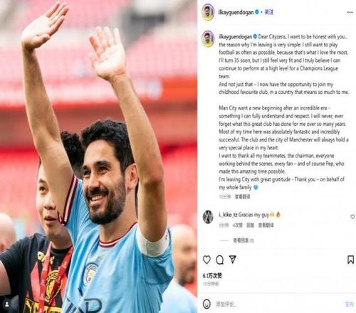 直播吧9月3日讯 34岁的德国中场京多安已经官宣加盟加拉塔萨雷,他也通过社媒发布了向曼城的告别信: 亲爱的城民们,我想对你们坦诚相告...我离开的原因非常简单:我依然渴望尽可能多地参加比赛,因为这始终是我最热爱的事。虽即将年满35岁,但我仍感觉状态上佳,并坚信自己能在欧冠球队持续贡献高水平表现。 不仅如此——如今我有机会加入儿时最喜爱的俱乐部,前往一个对我意义非凡的国度。 在经历辉煌时代后,曼城希望开启新篇章——我完全理解并尊重这个决定。我永远永远不会忘记这家伟大俱乐部多年来为我付出的一切。 在这里的绝大多数时光都无比美妙且充满非凡成就。俱乐部与曼彻斯特这座城市将永远在我心中占据特殊位置。 我要感谢所有队友、主席先生、每一位幕后的工作人员、所有的球迷——当然还有瓜帅,是他让这段美好时光成为可能。 我怀着无尽感激告别曼城——谨代表我的家人们向你们致谢 |
