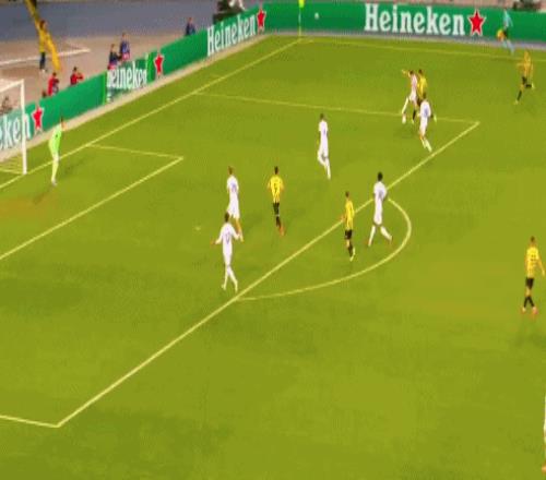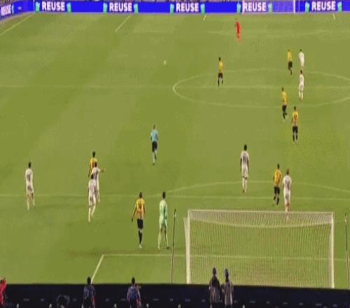 皇马是总身价14亿欧元的超级巨舰,阿拉木图凯拉特只是身价1270万欧元的欧冠鱼腩,双方实力差距明显。不过,阿拉木图凯拉特踢得非常开放,拒绝摆大巴死守。双方阵型拉开,姆巴佩就有足够的冲刺空间,库尔图瓦的大脚,也能变助攻。 第52分钟,皇马就打进最简单粗暴的进球: 这原本是阿拉木图凯拉特的进攻,皇马后场连续解围。弗兰-加西亚将球回传给门将库尔图瓦——这并不是最佳选择,看看塞巴略斯的手势,他要求弗兰-加西亚往前开大脚。
