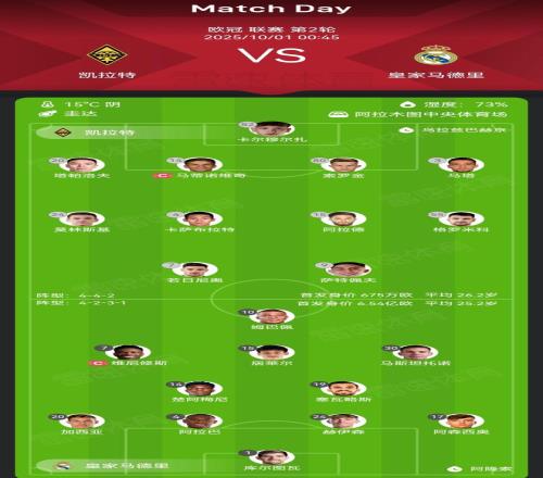 雷速体育10月1日讯 欧冠联赛阶段第2轮,皇家马德里远征哈萨克斯坦阿拉木图客场对阵凯拉特。赛前,两队首发阵容出炉。 值得一提的是,两队首发身价相差悬殊:凯拉特首发总身价只有675万欧元,而皇马首发11人总身价为6.54亿欧元,是凯拉特首发总身价的96.9倍。 |