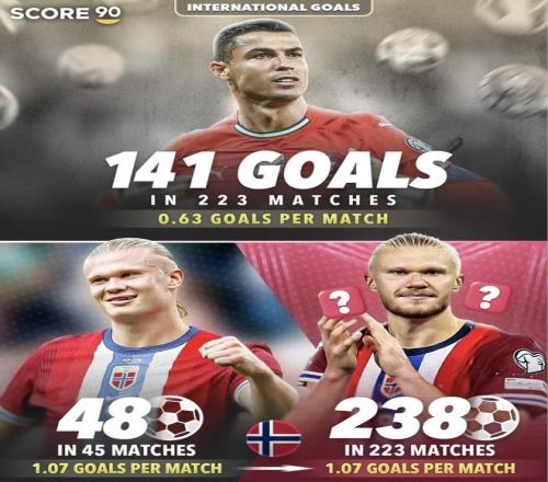 国家队数据C罗:223场 | 141球 |0.63球/场 哈兰德:45场 |4 8球 | 1.07球/场 (静态外推,仅作参考)若按1.07球/场踢到223场≈238球