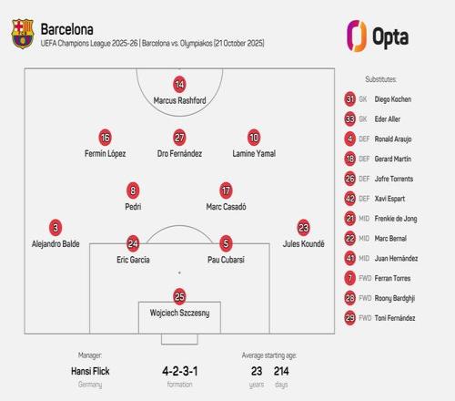 据统计,这是巴萨自2002年10月对阵布鲁日(22岁362天)和2011年12月对阵鲍里索夫(23岁93天)之后,在欧冠联赛第三年轻的首发阵容。27岁的拉什福德是场上最年长的非门将球员。 巴萨首发:25-什琴斯尼、3-阿莱士-巴尔德、5-库巴西、24-埃里克-加西亚、23-孔德、17-卡萨多、8-佩德里、10-亚马尔、27-德罗-费尔南德斯、16-费尔明、14-拉什福德 |