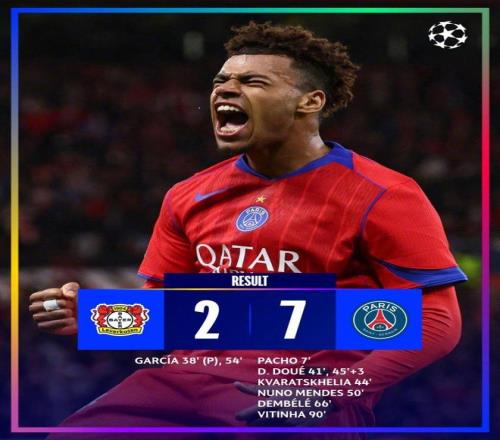 勒沃库森2-7巴黎圣日耳曼 上半场比赛安德里希和扎巴尔尼先后被红牌罚下,两队在场上均10人作战。大巴黎在半场4-1大比分领先勒沃库森,下半场比赛大巴黎攻势不减,继续门德斯、登贝莱和维蒂尼亚又先后取得进球,7-2赢下了这场进球大战的胜利。