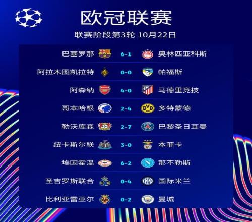 | 10月22日凌晨,欧冠联赛阶段第3轮第1比赛日结束9场争夺。本轮比赛上演进球狂潮,多场比赛打出高比分。巴塞罗那主场6-1大胜奥林匹亚科斯,卫冕冠军大巴黎7-2狂胜勒沃库森,埃因霍温6-2击败了那不勒斯。