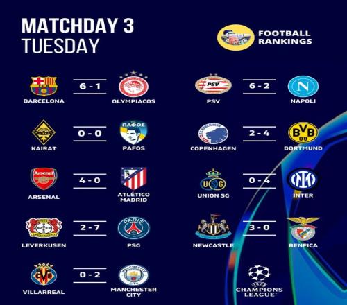 | 欧冠联赛阶段第3轮首个比赛日,各大豪门火力全开。在今日的9场比赛之中,除了阿拉木图凯拉特和帕福斯之间互交白卷之外,其余8场比赛狂轰43球,其中甚至还有巴黎7-2血洗勒沃库森、埃因霍温6-2大胜那不勒斯这样的比赛,而巴萨6-1击败奥林匹亚科斯的比赛进球数甚至都只能屈居第三。