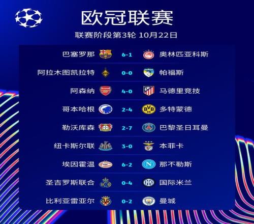 至此,本赛季欧冠第3轮首日的9场比赛战罢,仅有1场未产生进球,结果分别为: 巴塞罗那6-1奥林匹亚科斯、阿拉木图凯拉特0-0帕福斯、阿森纳4-0马德里竞技、哥本哈根2-4多特蒙德、勒沃库森2-7巴黎圣日耳曼、纽卡斯尔联3-0本菲卡、PSV埃因霍温6-2那不勒斯、圣吉罗斯联合0-4国际米兰、比利亚雷亚尔0-2曼城!