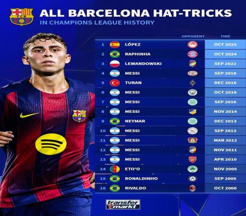 欧冠改制以来巴萨球员戴帽榜:梅西8次居首,费尔明上榜