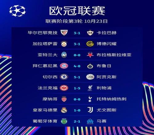 其他几场比赛当中,毕尔巴鄂竞技3-1战胜了卡拉巴赫,加拉塔萨雷3-1击败博德闪耀,亚特兰大0-0同布拉格斯拉维亚互交白卷,切尔西主场5-1大胜阿贾克斯,摩纳哥0-0同热刺握手言和,葡萄牙体育主场2-1击败马赛队。 积分榜方面,大巴黎、拜仁、国米、阿森纳和皇马5支队伍均取得3连胜,目前排在积分榜前5位。积7分的有多特蒙德和曼城2队,纽卡斯尔、巴塞罗那、利物浦、切尔西、葡萄牙体育、卡拉巴赫和加拉塔萨雷7支队伍,均取得2胜1负的战绩。 |