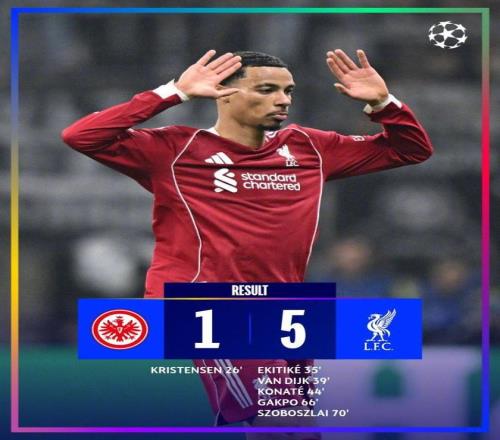 法兰克福1-5利物浦 第26分钟克里斯滕森小角度射门得手,主队法兰克福取得领先。第35分钟埃基蒂克面对旧主单刀破门,利物浦追平比分。范戴克和科纳特又先后取得进球,半场利物浦3-1领先。第66分钟加克波门前包抄破门,利物浦将比分改写为4-1。第70分钟索博斯洛伊轰出世界波,比分定格在5-1。