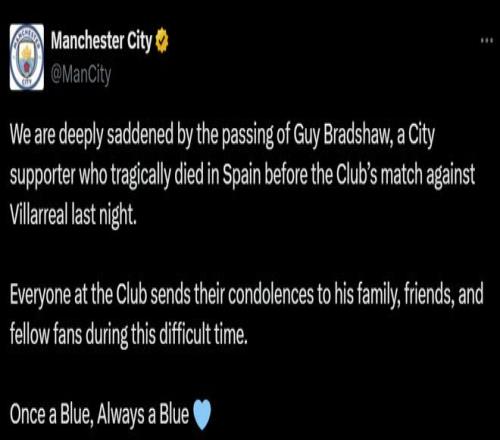 欧冠赛前一名曼城球迷在西班牙不幸去世,曼城官方发文哀悼