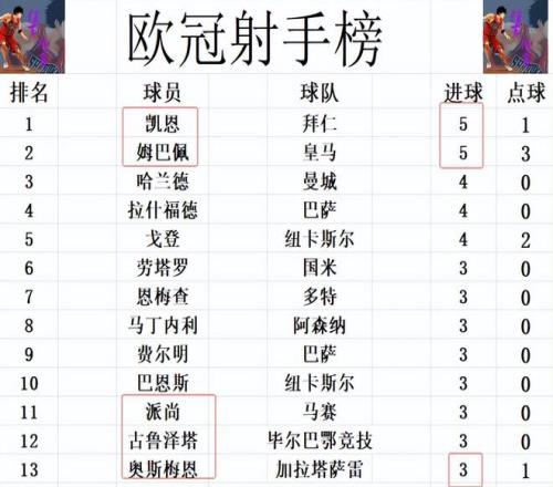 射手榜方面,姆巴佩今天错失良机没有进球,被打入1球的凯恩追上,两人5球并列榜首。哈兰德,拉什福德和戈登4球并列第3。古鲁泽塔,奥斯梅恩,派尚破门,追上劳塔罗,费尔明等人3球刚好挤入前十。 |