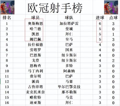 射手榜方面,奥斯梅恩缺阵,还是6球位列榜首,哈兰德,凯恩和姆巴佩5球并列第2。拉什福德,劳塔罗,巴恩斯和戈登4球并列第5。马丁内利,费尔明,麦克托米奈,略伦特等人3球刚好挤入前十。 |