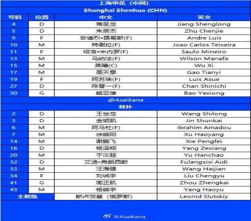 申花首发:30-鲍亚雄、4-蒋圣龙、5-朱辰杰、9-安德烈-路易斯、10-特谢拉、11-米内罗、13-马纳法、15-吴曦、17-高天意、19-阿苏埃、27-陈晋一