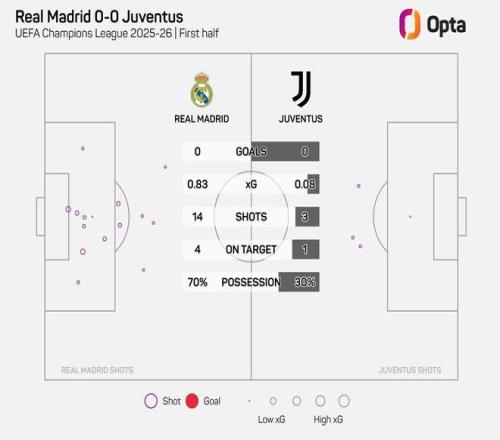 战尤文14次射门,为皇马本赛季没进球上半场中射门最多的
