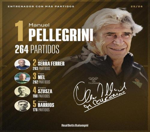 264场!佩莱格里尼成为贝蒂斯队史执教场次最多主帅