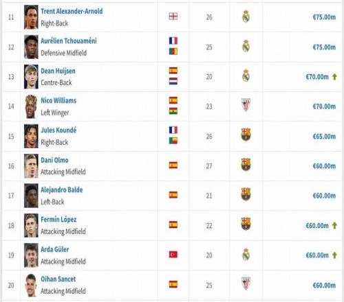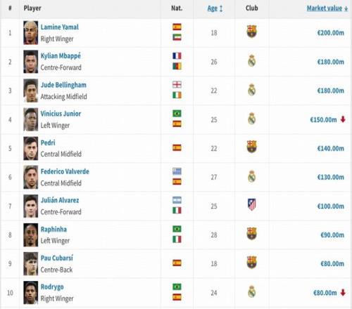 西甲球员身价更新:亚马尔2亿欧仍居首,维尼修斯跌至1.5亿欧,7人上亿