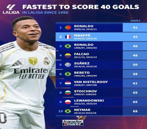 | 北京时间10月8日,来自德转的统计指出,姆巴佩成为了自1990年以来,在西甲联赛达成40球大关所用场次第二少的球员,仅次于C罗。